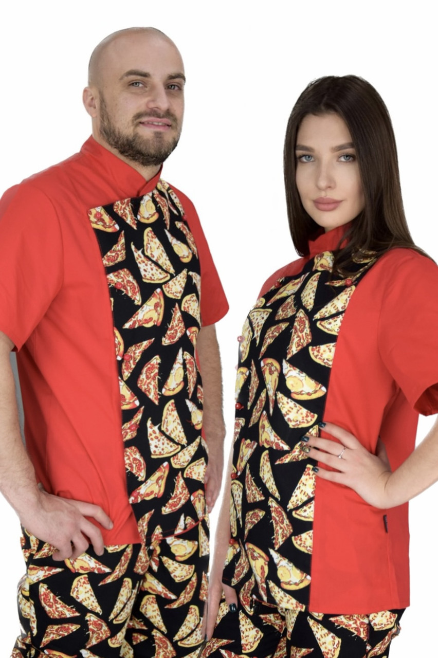 Куртка-китель — основний колір виробу червоний зі вставкою на нагруднику з принтом «ПІЦА». Виріб напівобтислого силуету, застібається на один борт за допомогою 7 спеціальних ґудзиків (пуклі). Кухарську форму можна купити з ушивним рукавом, вільного крою, короткий рукав